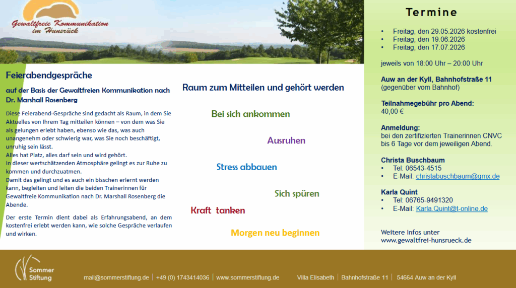 In diesem Rahmen werden seit April 2024 verschiedene Veranstaltungen regelmäßig und als Einzelveranstaltung angeboten. Die Teilnahme ist erwünscht und auch die Möglichkeit, eigene Ideen einzubringen. Termine können gebucht werden über mail@sommerstiftung.de oder telefonisch unter 06580-9175400.
